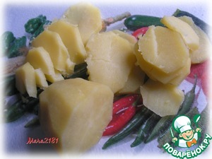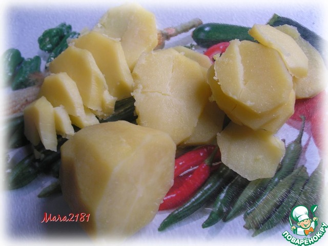 Сваренный заранее и остывший картофель нарезать пластинами.