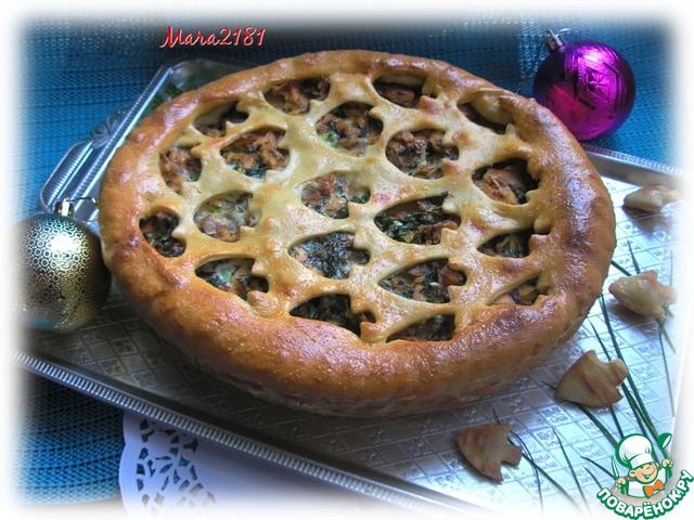Закрываю поверхность пирога подготовленным тестом и аккуратно защипываю края. Взбить 1 яйцо и смазать им поверхность пирога.