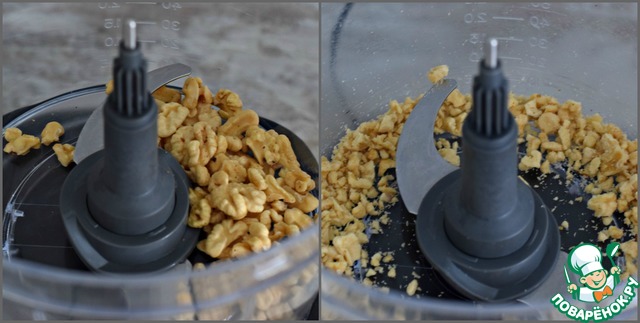 Заранее прокаленные грецкие орехи измельчить в крошку среднего размера.