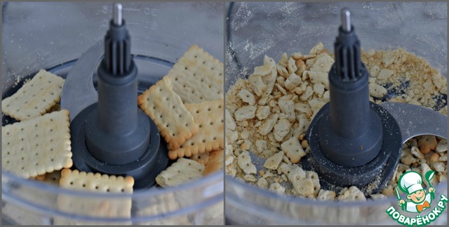 Также измельчить и печенье. Печенье можно использовать любое: несладкий крекер, песочное, сахарное, овсяное. В этот раз я готовила десерт с галетным печеньем.