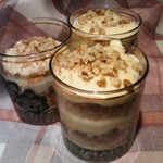В креманку (бокал, стаканчик) положить примерно столовую ложку крема. На крем равномерно распределить печенье. Сбрызнуть печенье коньяком. (это по желанию!) -