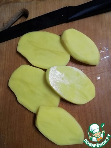 Все делается очень просто и быстро. Картофель очистить и нарезать пластинками.