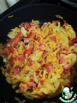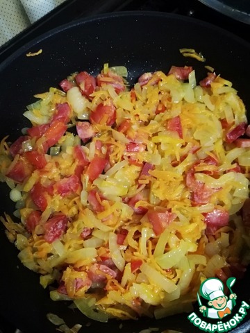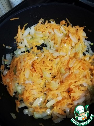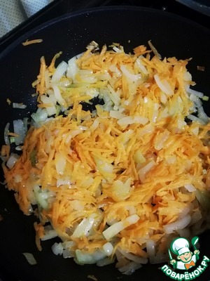 Лук нарезать полукольцами и слегка обжарить на подсолнечном масле. Морковь очистить и натереть на крупной тёрке. Добавить морковь к луку и продолжать обжаривать.