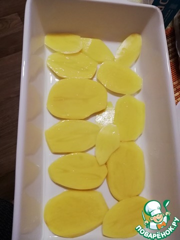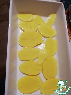 Форму для запекания смазать маслом и выложить ломтики картофеля. Картофель слегка присолить. Это не позволит рыбе подсушиться в духовке, а картофель прекрасно подойдёт в качестве гарнира.