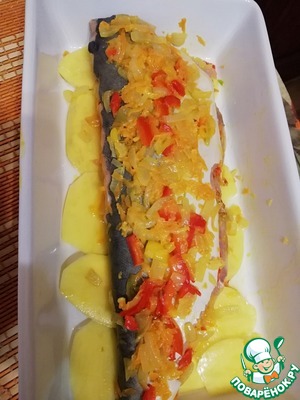 На картофель выложить горбушу. На одну часть рыбы выложить овощную начинку. Немного начинки оставить для верха рыбы.