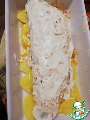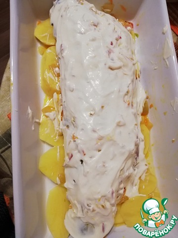 Закрыть второй половиной рыбы. Выложить оставшуюся начинку по все поверхности.