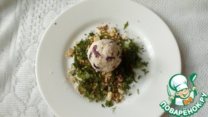 Из творожной массы слепить шарики и обвалять их в орешках и зелени.