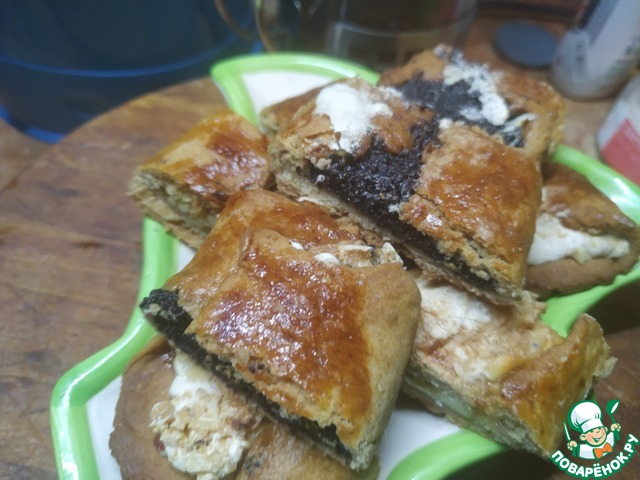 Накрыть "внахлест", чтобы слой перекрыл другой слой. Край, для лучшей фиксации, смазать яйцом. Верх тоже смазать яйцом.