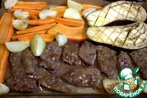 Печень нарезать ломтиками. Перенести на пергамент в форму с овощами.