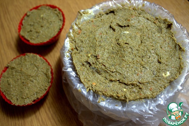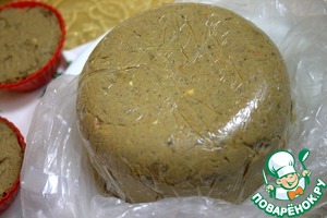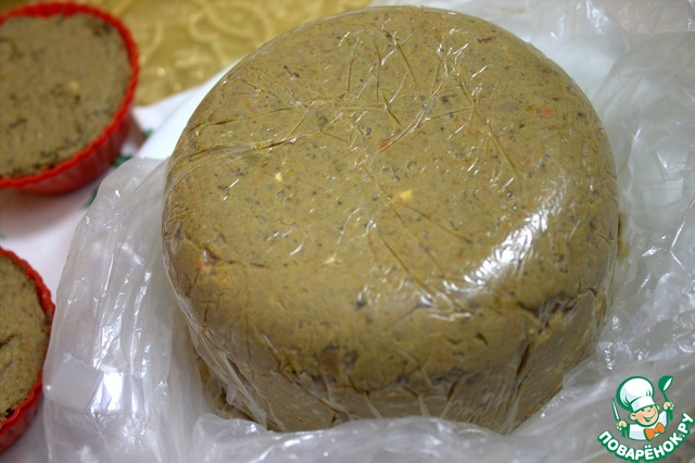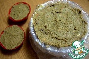 Чтобы придать форму для стола я взяла чашу небольшую, застелила плёнкой и заполнила паштетом.
