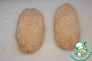 И запанировать в сухарях. Кстати, я насыпаю сухари в небольшую емкость, кладу в них зразу. и начинаю катать ее, взяв в руки емкость и потрушиваю ее от себя и к себе, и так несколько раз. Не портится форма и сухари прилипают равномерно. Чем о похоже на действие просеивания муки. ))