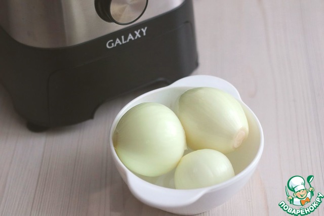 Лука в данном рецепте пирога потребуется чуть больше, 3-х шт. будет вполне достаточно. Чтобы облегчить процесс измельчения лука, будем использовать кухонный комбайн GALAXY GL2300.