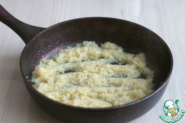 Сковороду вернуть на медленный огонь и слегка протушить рыбно-луковый фарш. При необходимости отрегулировать по вкусу соль и молотый белый перец. -