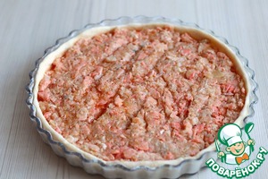 Тесто разделить на 2 части, раскатать в пласты толщиной 0,5-0,7 см. Пласт теста перенести в форму для выпекания пирога. Предварительно форму смазать тонким слоем сливочного масла, присыпать мукой, сделать "французскую рубашку".
