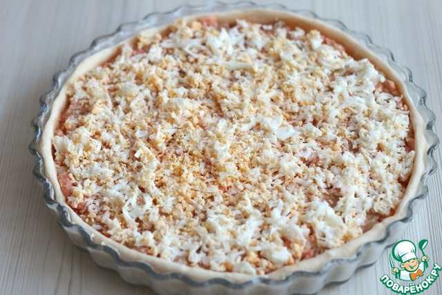 Яйца (2 шт.) отварить, натереть яйца на мелкой терке сверху на рыбный фарш.