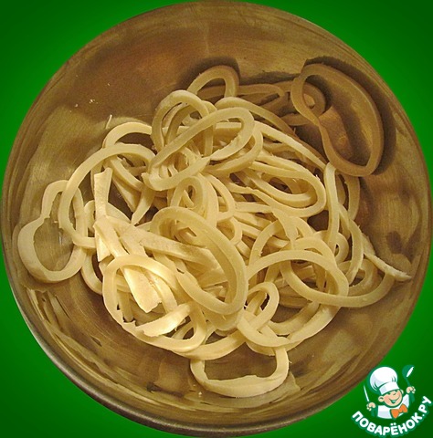 Очищенные от шкурки кальмары по одному бросаем в кипящую подсоленную воду и варим 45 секунд. После охлаждения нарезаем тонкими кольцами