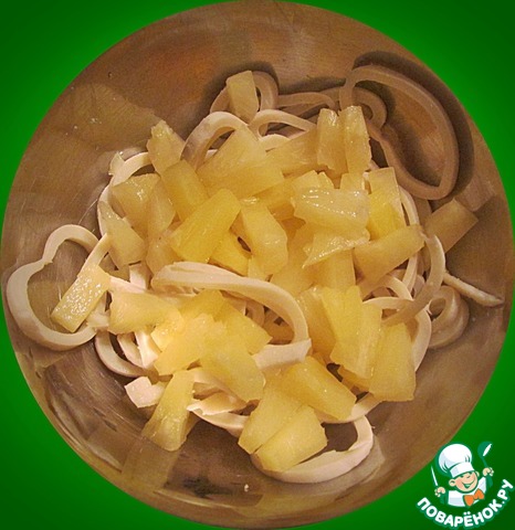 На кальмары выкладываем отцеженные от сока кубики консервированного ананаса