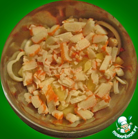 Сверху выкладываем крабовые палочки, нарезанные тонкими кружочками
