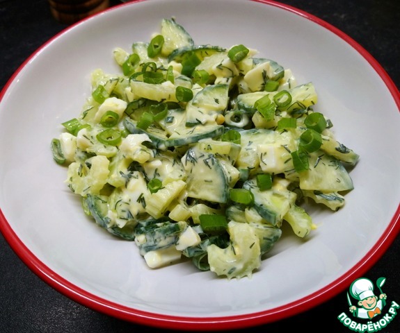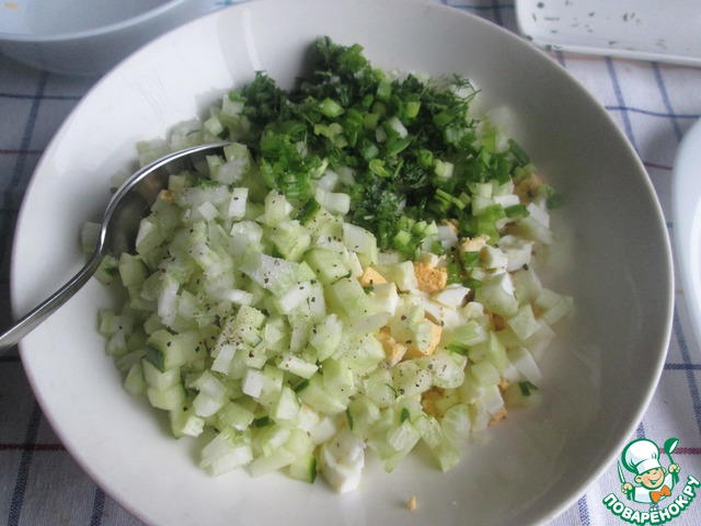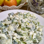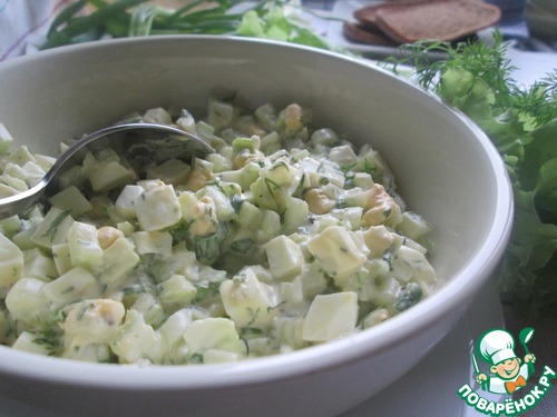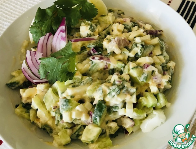 Этому яичному салату придают свежесть и приятный вкус огурец и черешковый сельдерей. Получается сытно и аппетитно!