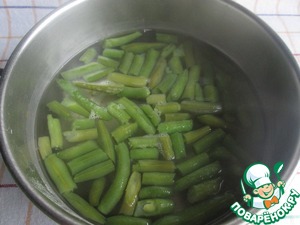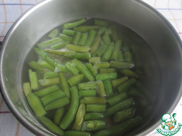 Стручковую фасоль бланшировать 5-6 минут, затем откинуть на дуршлаг и дать стечь воде.