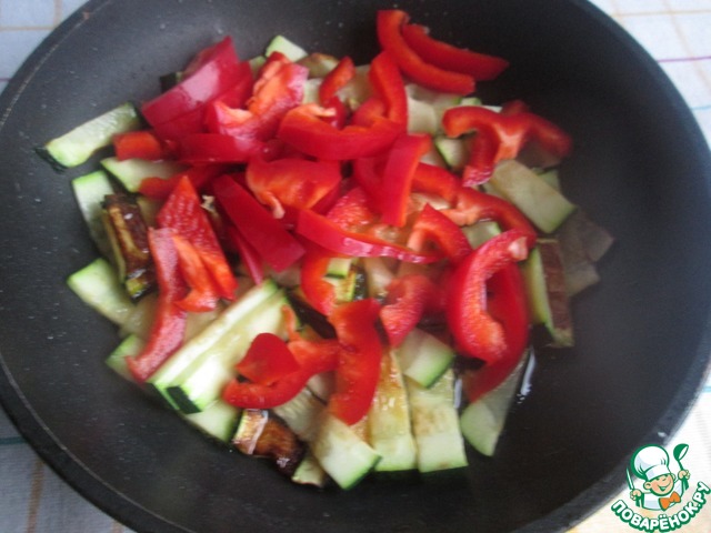 Перец без семян нарезать брусочками, добавить к цуккини, слегка посолить, и продолжать жарить, помешивая, до готовности.