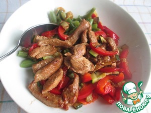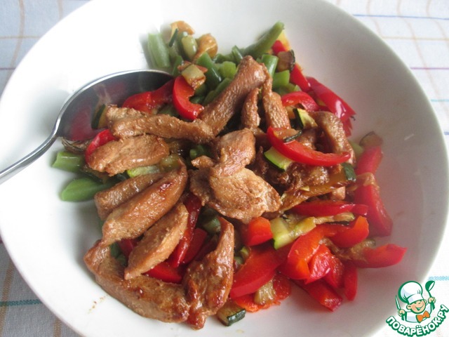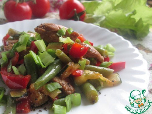 Поместить в салатник стручковую фасоль, цуккини, перец и курицу. Поперчить.