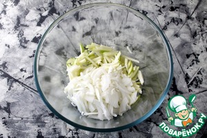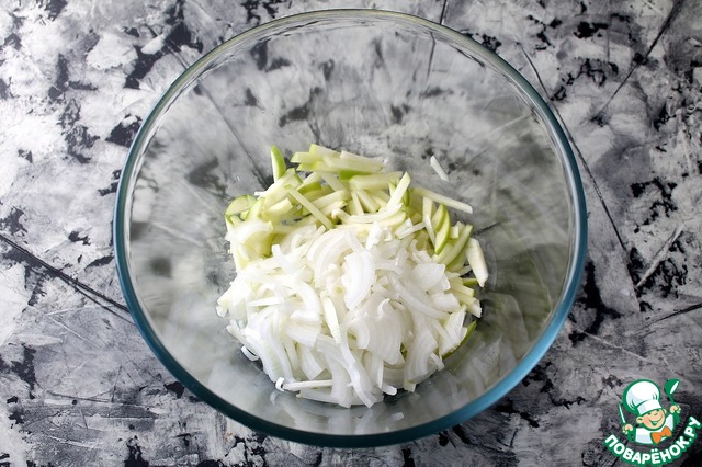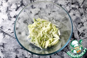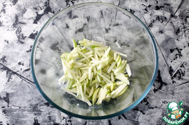 Яблоко (зеленое, лучше, Гринни Смит) нарезать тонкими ломтиками.