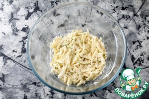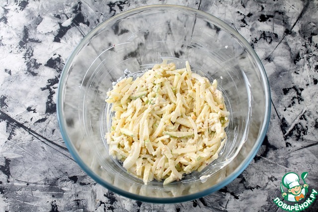 Вкусная, сытная закуска с ярким и необычным вкусом. Закуску можно подать как полноценный салат или выложить салат на ломтик черного хлеба и подать с сельдью.