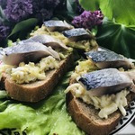 Нарезать черный хлеб, сверху положить немного салата и пару ломтиков селедки (я использовала пресервы).