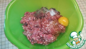 В глубокой миске смешать фарш с яйцом, майораном, солью и перцем.