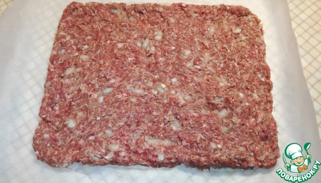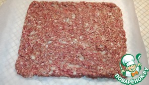 На листе пергамента делаем из фарша прямоугольник, у меня 25×30 см.