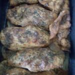 Заливаем приготовленным маринадом, втирая его в поверхность. Оставляем минут на 10-15. В принципе, можно это сделать заранее и пусть подготовленная курица ждет своего часа в холодильнике.