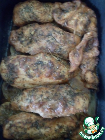Курицу нарезаем крупными кусками, размером с бедрышко курицы. Я бы рекомендовала готовить только из филе. Тогда у вас есть возможность убить двух зайцев: подать курочку в горячем виде, а когда остынет - получится шикарная пастрома на бутерброды. Тем более, что готовится все совсем нехлопотно.