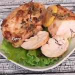 Выкладываем кусочки курицы. Кладем сверху веточки тимьяна, немного сбрызгиваем лимонным соком и ставим запекаться в разогретую до 200 градусов духовку минут на 30-40. Впрочем, ориентируйтесь по своей духовке: курочка должна зарумяниться. А по кухне должны завитать совершенно невозможные ароматы запеченного лимона с травами.