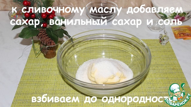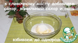 К сливочному маслу добавляем сахар, ванильный сахар и соль. Взбиваем до однородности.