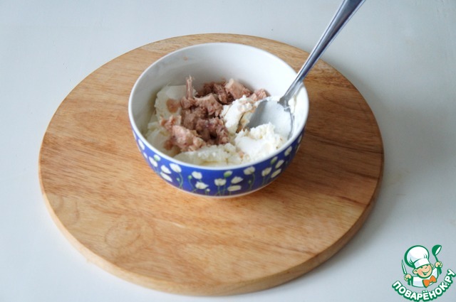 Смешать кусочки тунца и творожный сыр.