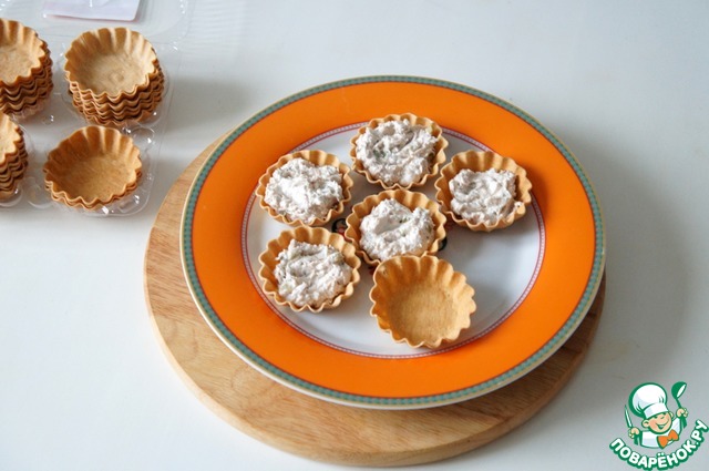 Наполнить тарталетки получившимся салатом при помощи двух ложек.