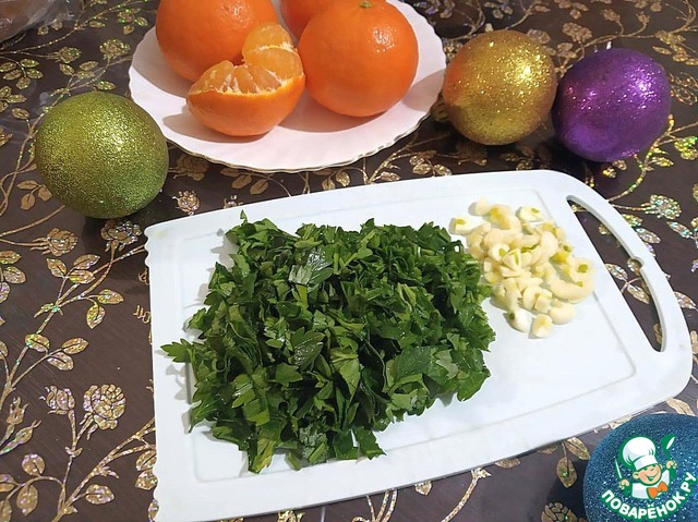 Измельчаем зелень (у меня петрушка в этот раз) и чеснок.