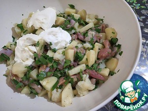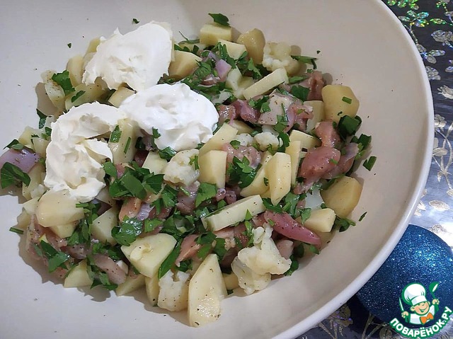 В глубокую миску складываем все наши подготовленные ингредиенты, добавляем три ложки сметаны. Солим и приправляем по вкусу и аккуратно перемешиваем.