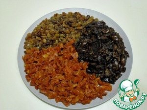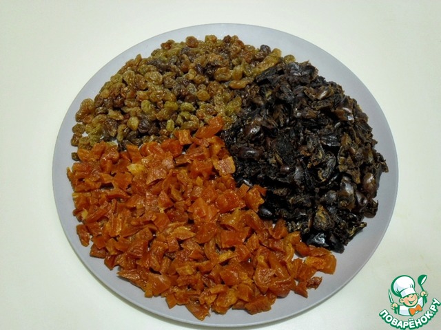 Сухофрукты помыть и обсушить. Финики освободить от косточек, нарезать средними кусочками, так же нарезать курагу, оставив несколько долек целыми для верха.