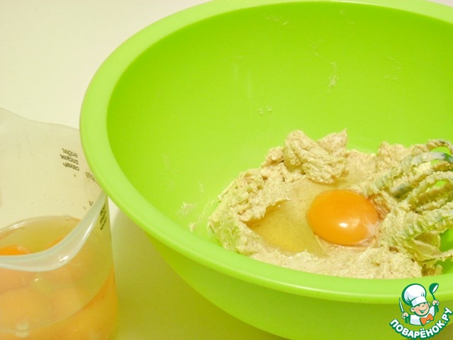 В масляно-сахарную смесь вливать по одному яйца, взбивая на малой скорости миксера.