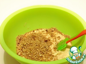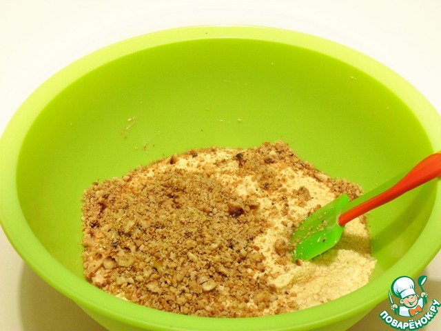 Грецкие орехи обжарить на сухой сковороде, очистить от шелухи. Истолочь в ступке, но не в муку, а в крупку.