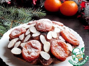 Обсыпать миндальными лепестками или молотыми орехами, выложить дольки кураги, припудрить сахарной пудрой.