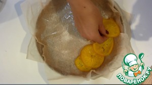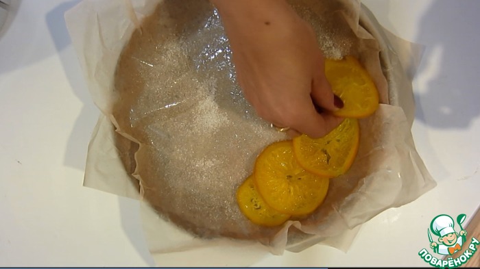 Посыпаем форму сахаром и выкладываем дольки апельсинов.