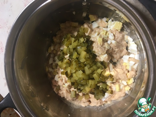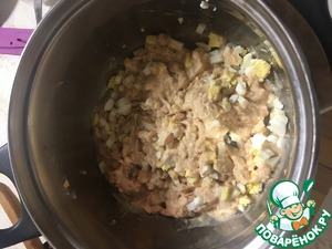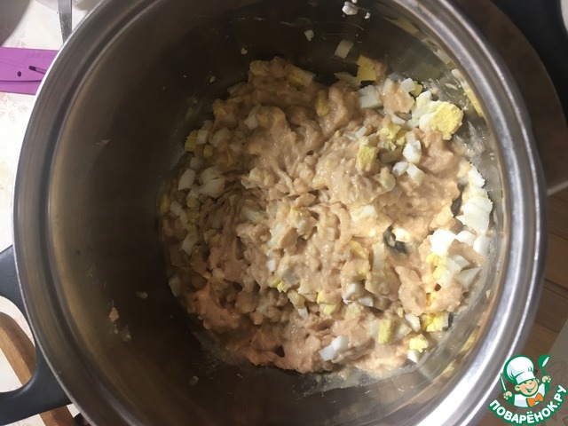 Измельчить печень трески. Добавить мелко нарубленное яйцо.