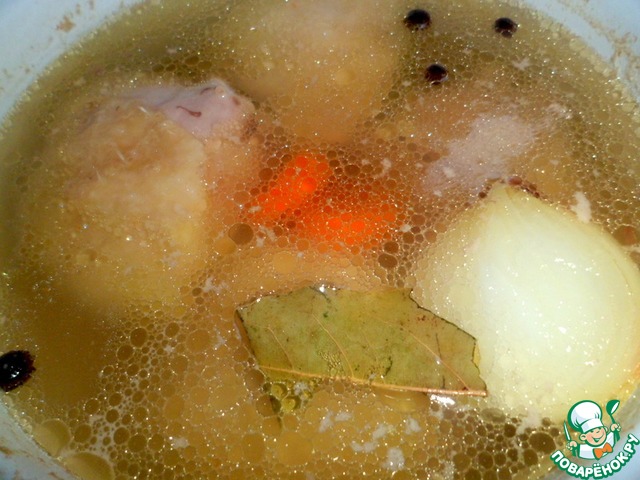 По идеи, с окорочков нужно снять кожу частично или совсем, первое - много жира, второе - бульон станет мутным. Но я оставляю на одном, потом при разделке убираю. Вот, как видите, на фото -бульон светлый получился. И так, окорочка хорошо промыть, сложить в кастрюлю, залить водой, довести до кипения. Воду слить, окорочка промыть и снова залить свежей водой. Как только закипит, если появится пена, снимать, но обычно ее уже мало, но для прозрачности бульона, стараемся все снять.
