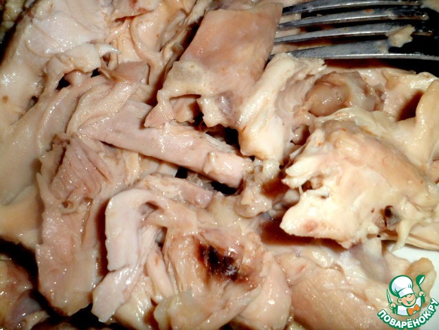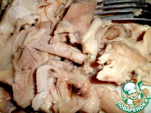 Вынуть мясо из бульона, дать слегка остыть и разобрать его на кусочки. Лишние прожилки, хрящики, жир, шкурку (если есть) удаляем. Это можно оставлять в холодце, если любите. Нарезаем мясо небольшими кусочками.