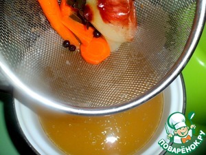 Бульон нужно процедить в другую посуду. Замерить его количество. Так как, готовим куриное заливное, то дополнительно нужно приготовить желе. Отлить примерно 150мл бульона и развести желатин, дать ему набухнуть. Смотрите на упаковке способ применения. Затем желатин распустить на водяной бане или в микро, не доводя до кипения, т. е. не превышая 70°C. Влить желе через ситечко в бульон, перемешать, попробовать на соль. Желатин разводим из расчета: 10 г желатина на 0,5л бульона.