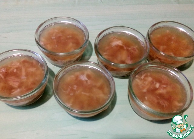 Разложить мясо порционно и залить бульоном. По желанию, в него можно добавить самые разные продукты. Под слоем прозрачного желе они превратятся в эффектное украшение. Особенно здорово выглядит порционное заливное из курицы. А вот в классический холодец такие продукты не добавлять. Поставить заливное в холодильник для застывания. Если остался бульон, вы можете залить им любые овощи, с мясом или рыбой. Извините за ночное фото, оно никак не хотело получаться. Об'єм баночек 130мл