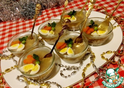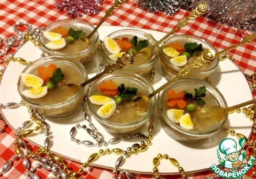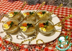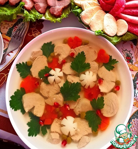 У нас есть традиция, каждое 2 января собираются родственники и играют весь день в Монополию. В этот день готовятся фуршетные закуски, канапе, бутерброды, нарезка рыбная, овощная, мясная, сырная, а так же - порционные салаты. Не исключение и традиционное заливное из курицы. Блюдо получается нежное, диетическое, очень праздничное угощение для любого торжества. Его можно приготовить за день-два и с ним ничего не произойдет. Ведь всегда на праздники много хлопот с другими блюдами, которые нужно подавать непосредственно на стол, с пылу-жару.